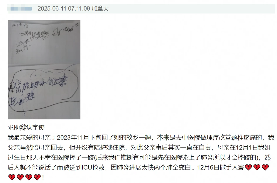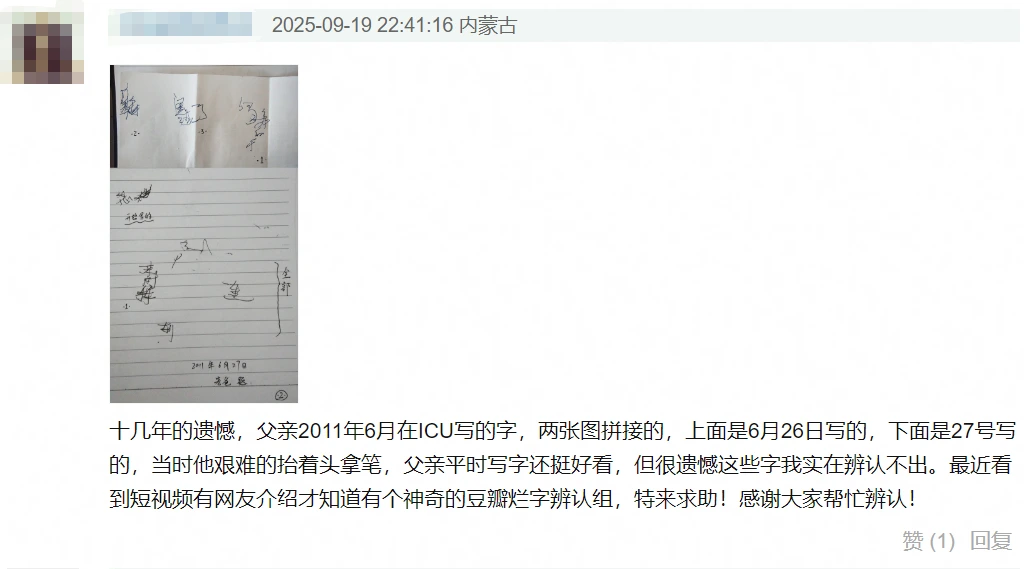 在当时的帖子中,求助者请人帮忙辨认已故父亲留下的笔迹。