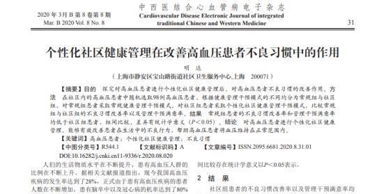 [1]明达.个性化社区健康管理在改善高血压患者不良习惯中的作用[J].中西医结合心血管病电子杂志,2020