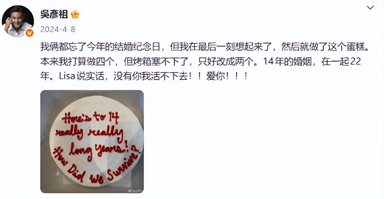 去年结婚14周年,吴彦祖发了张烤糊的蛋糕照片,配文“本来想做四个,烤箱塞不下,只好烤两”,后面加了句“Lisa说实话,没有你我活不下去”,把多少人看哭了。