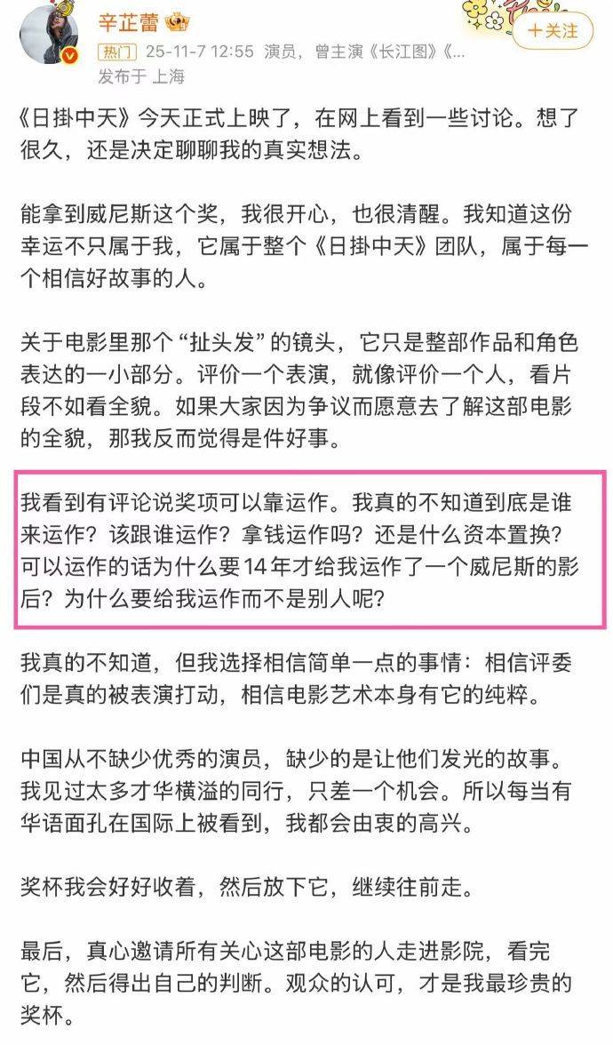 此前,网传一张郝蕾朋友圈截图引发热议,其中写道:“威尼斯凭借一个女演员扯头发就可以得影后,这个影后还有含金量吗?”对此,辛芷蕾发长文回应新片《日掛中天》争议,她表示电影中“扯头发”的镜头只是一小部分,希望大家去了解全貌。