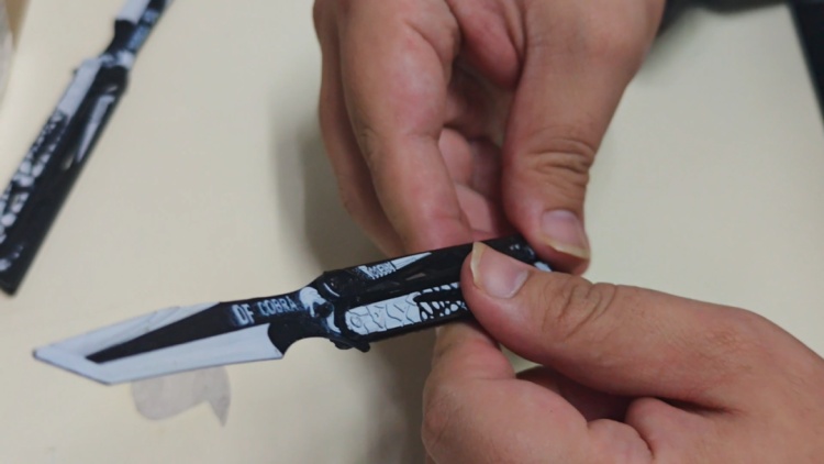 记者观察发现,虽然声称只是玩具,但其分量十足,质地坚硬,刺刀皮肤还是有明显的痛感。它来切割纸张和纸箱也没有任何问题,还是具备一定的危险性。