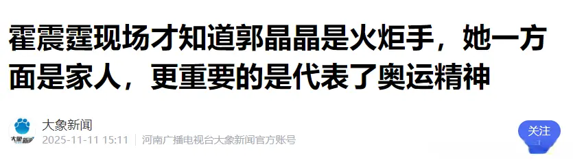 大象新闻——霍震霆现场才知道郭晶晶是火炬手,她一方面是家人,更重要的是代表了奥运精神