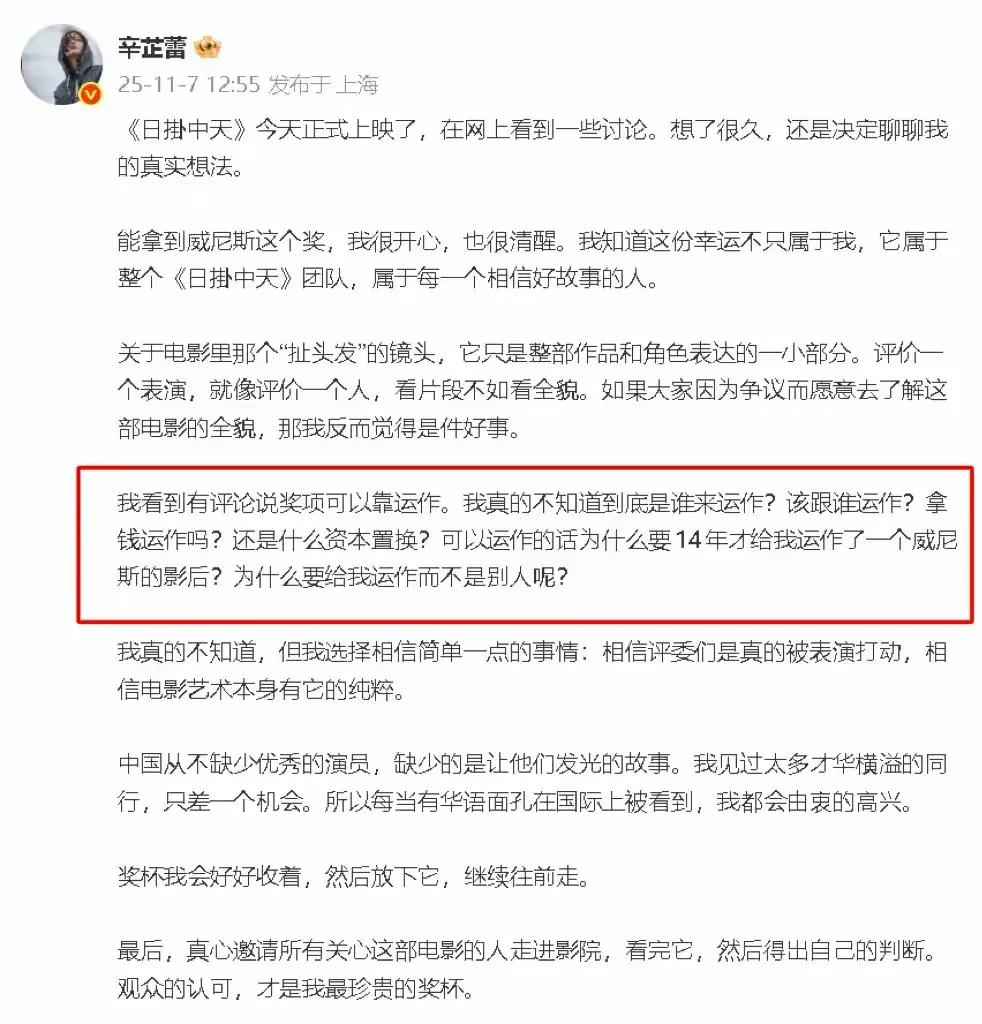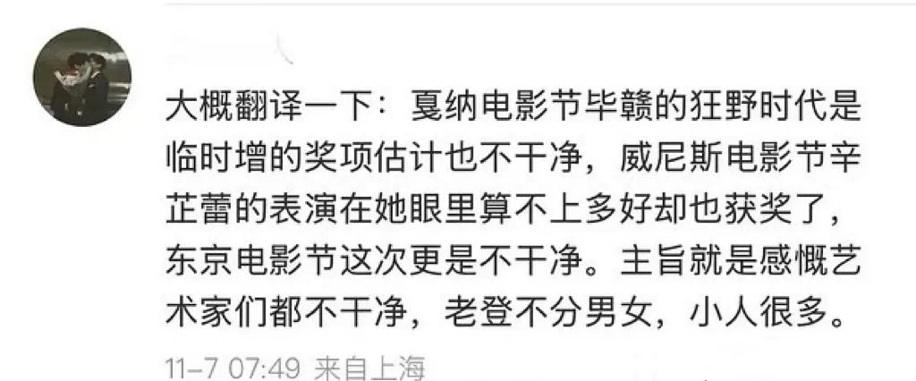 诸如拿钱买奖、评委没实力…大多都说得很晦涩,唯有其中一句格外直白,说辛芷蕾的威尼斯影后没有含金量。