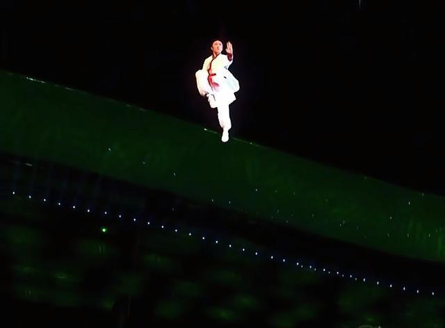 他表演的节目也是新时代被众多人们熟知的咏春拳,只见他从天而降,吊着威亚,在水中打着拳,并用咏春最有代表的八斩刀在水中用的游刃有余。