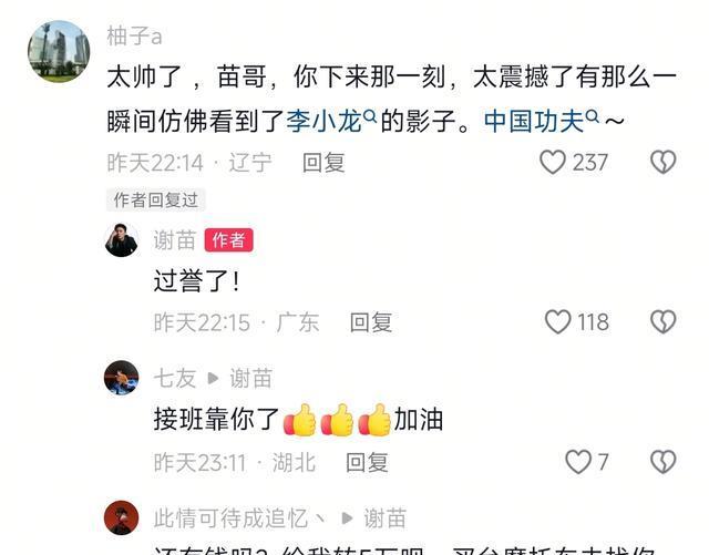 事后更是有粉丝给他留言道太帅了 ,苗哥,你下来那一刻,太震撼了有那么一瞬间仿佛看到了李小龙的影子。中国功夫~