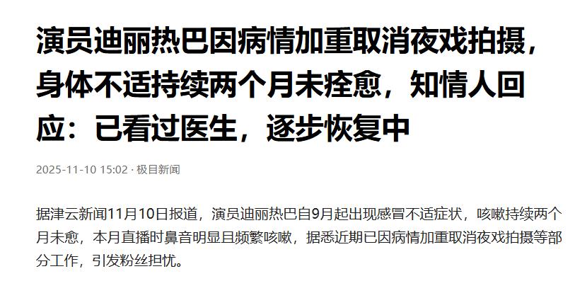此外,媒体也关注到了此事,媒体报道称从今年9月开始,迪丽热巴就出现了感冒不适症状,咳嗽持续2个月没有痊愈。