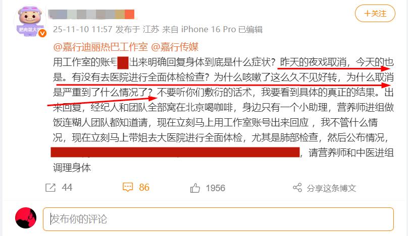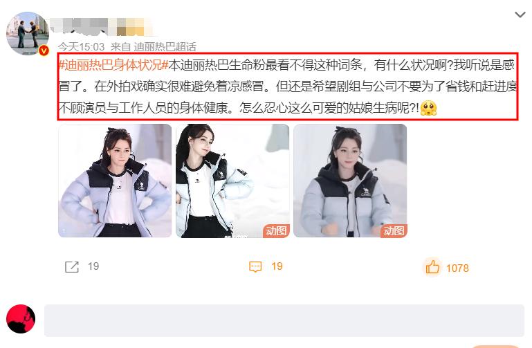 还有粉丝发文喊话迪丽热巴的经纪公司,希望能升级对迪丽热巴的保障,增加随行人手,配备跟组营养师。