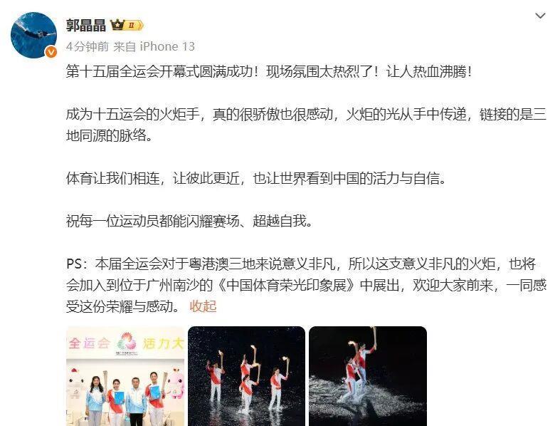 11月10日,郭晶晶在个人社交平台 发文,“ 第十五届全运会开幕式圆满成功!现场氛围太热烈了!让人热血沸腾!成为十五运会的火炬手,真的很骄傲也很感动,火炬的光从手中传递,链接的是三地同源的脉络。 ”