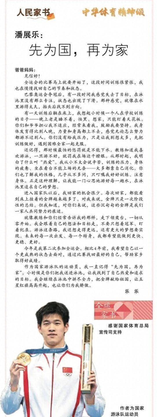 11月10日,有官媒公开发出了潘展乐写给家人的“家书”。