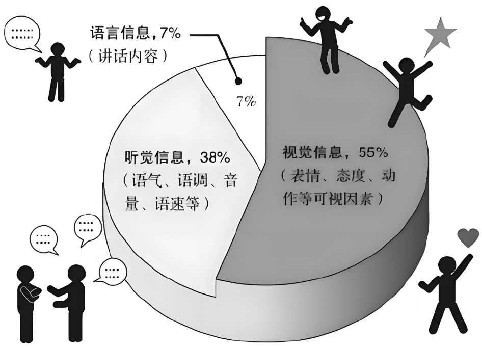 他指出,在人与人交往的过程中,7%来来自于言语内容,38%来自于声音语调,55%来自于肢体语言。