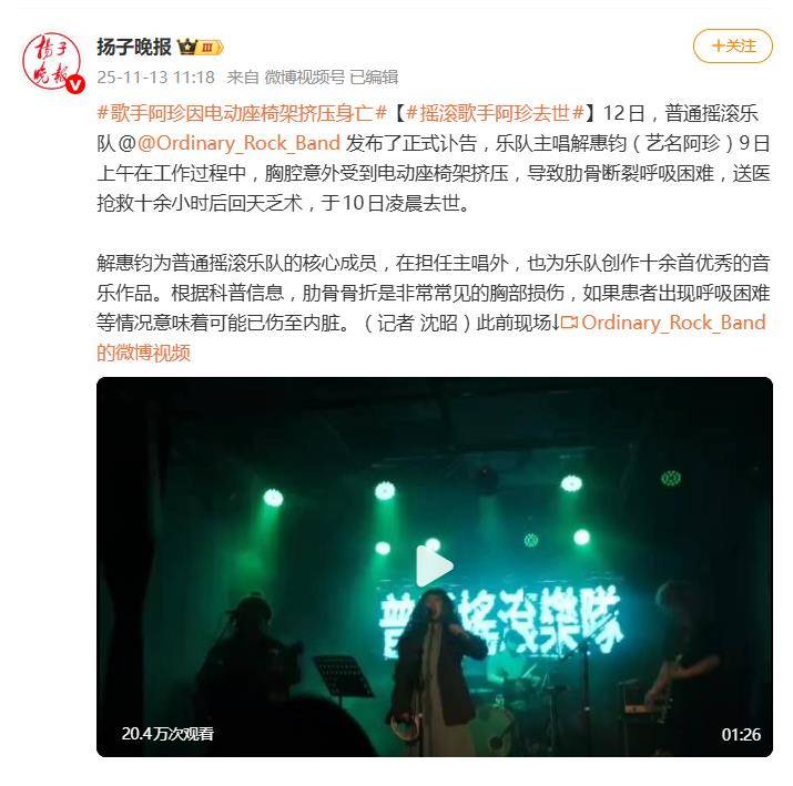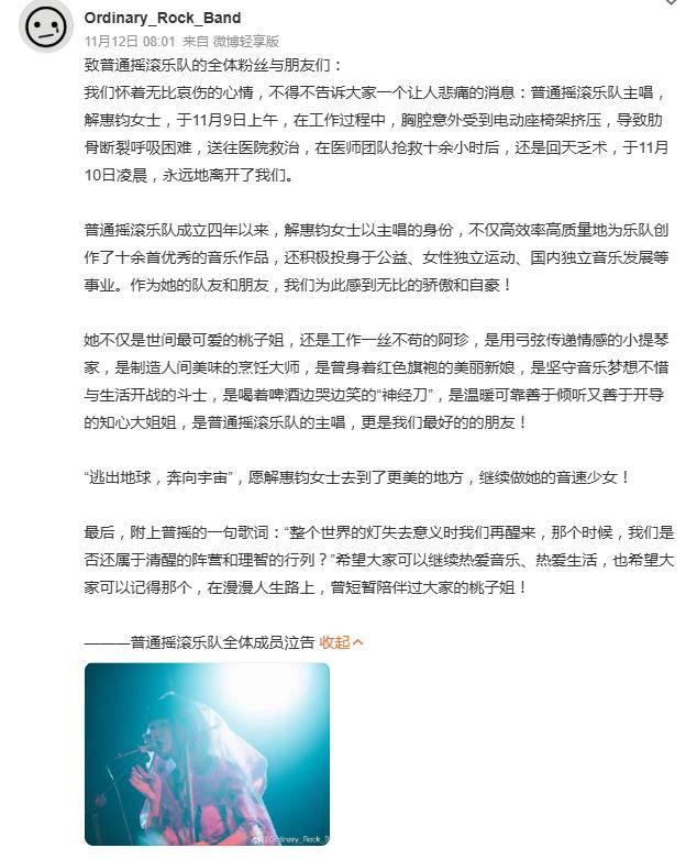 一则突如其来的噩耗,让整个独立音乐圈陷入悲痛。11月12日,独立摇滚乐队“普通摇滚乐队”(Ordinary_Rock_Band)正式发布讣告,确认乐队主唱解惠钧(艺名阿珍)因工作期间遭遇意外,经抢救无效于11月10日凌晨不幸离世。