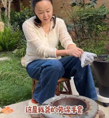 为了避免把手弄脏,王一楠戴上了她老爸的劳保手套,其实就是农民工干活用的线手套。
