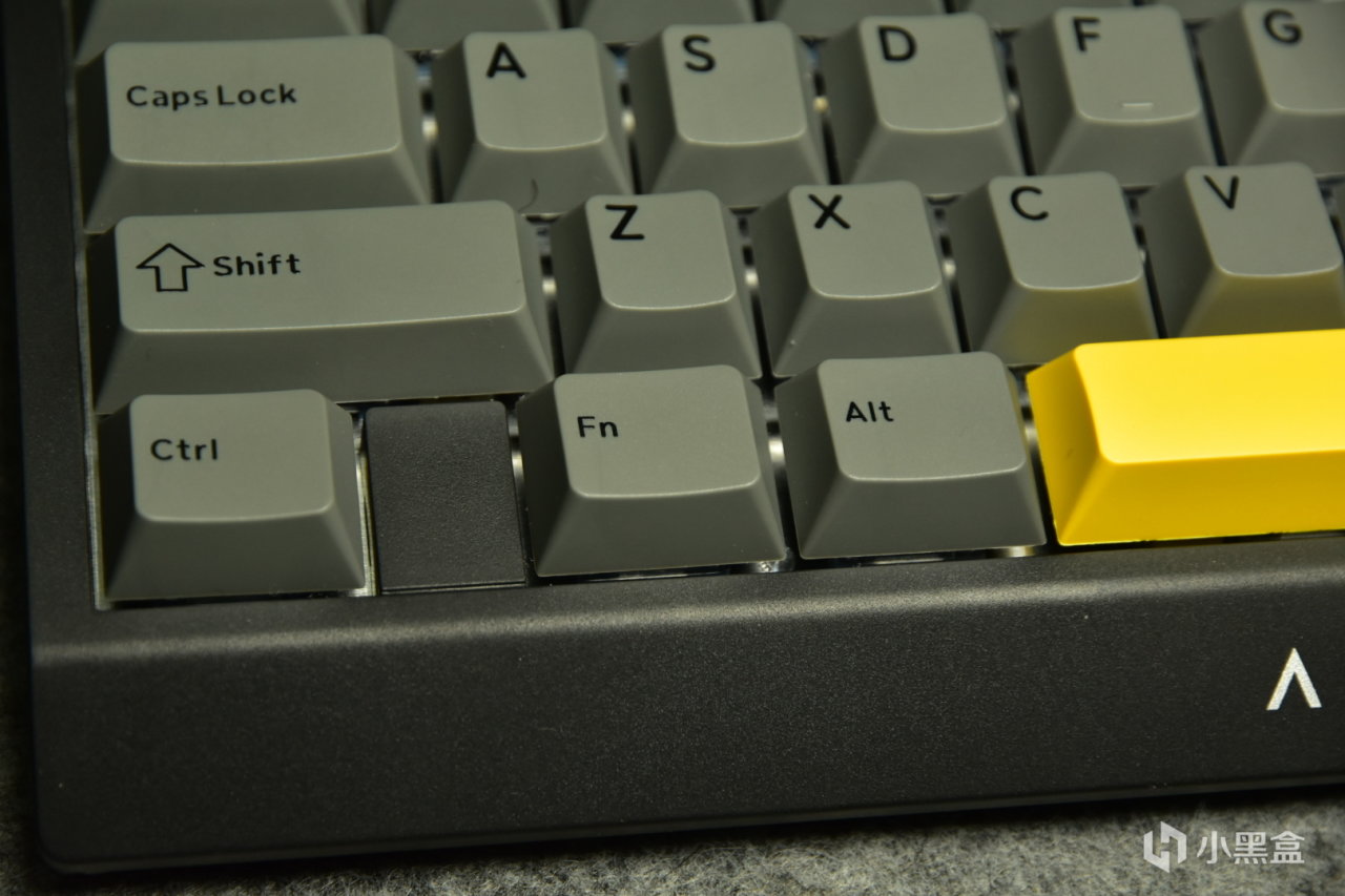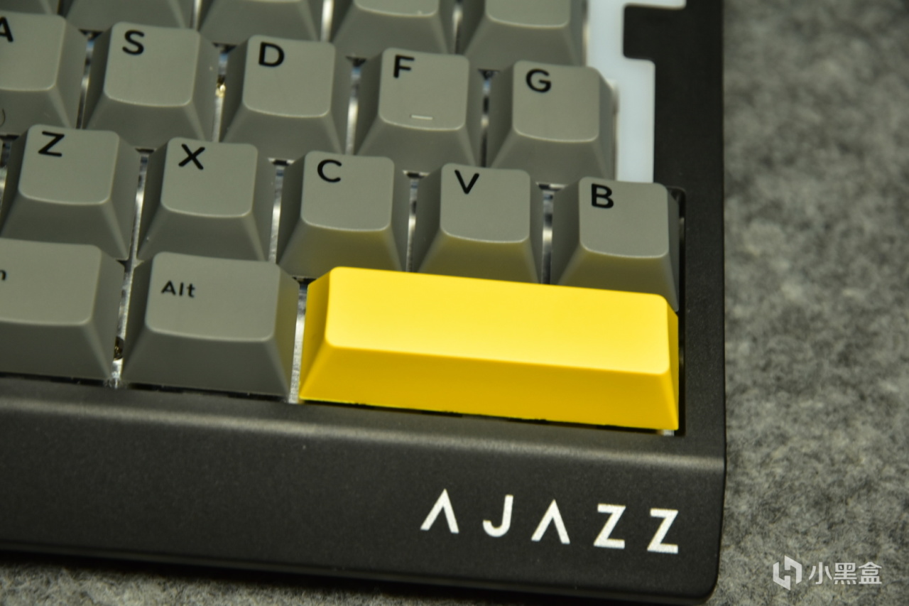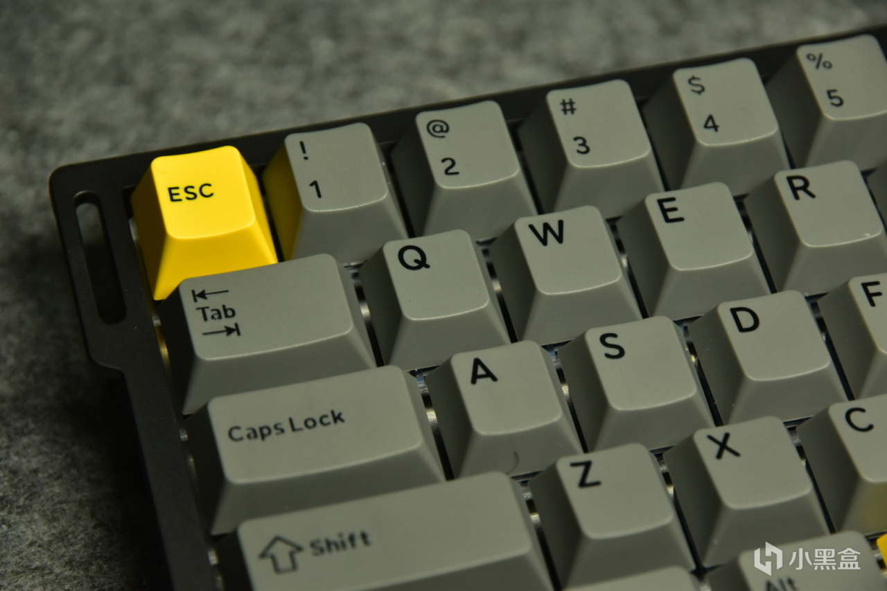 键盘的键帽为PBT材质,经久耐用不易打油,这点不必多说,键帽不是纯黑色,而是偏灰色,搭配黄色的 Esc 键和空格键,整体看起来不会那么单调。