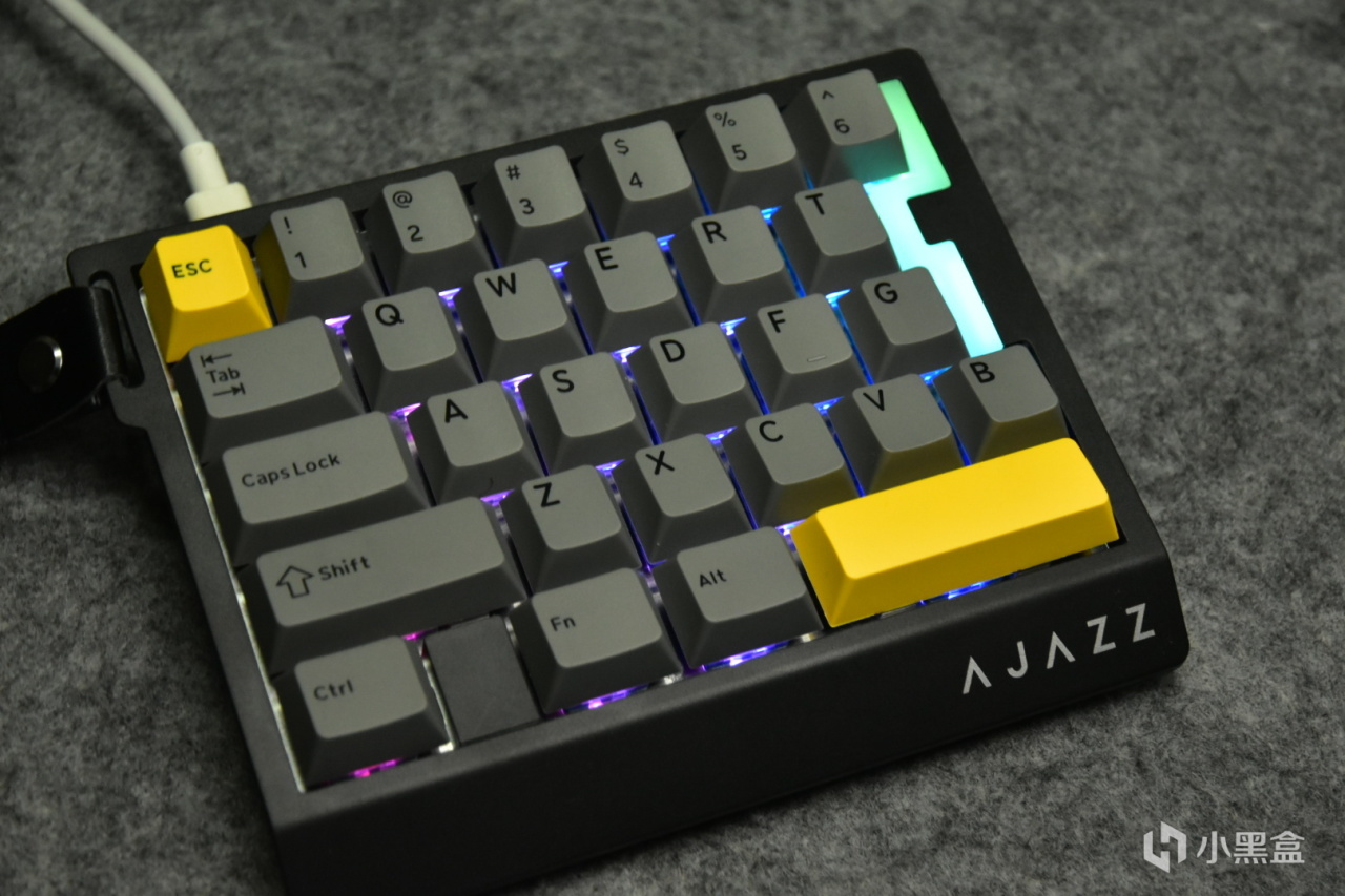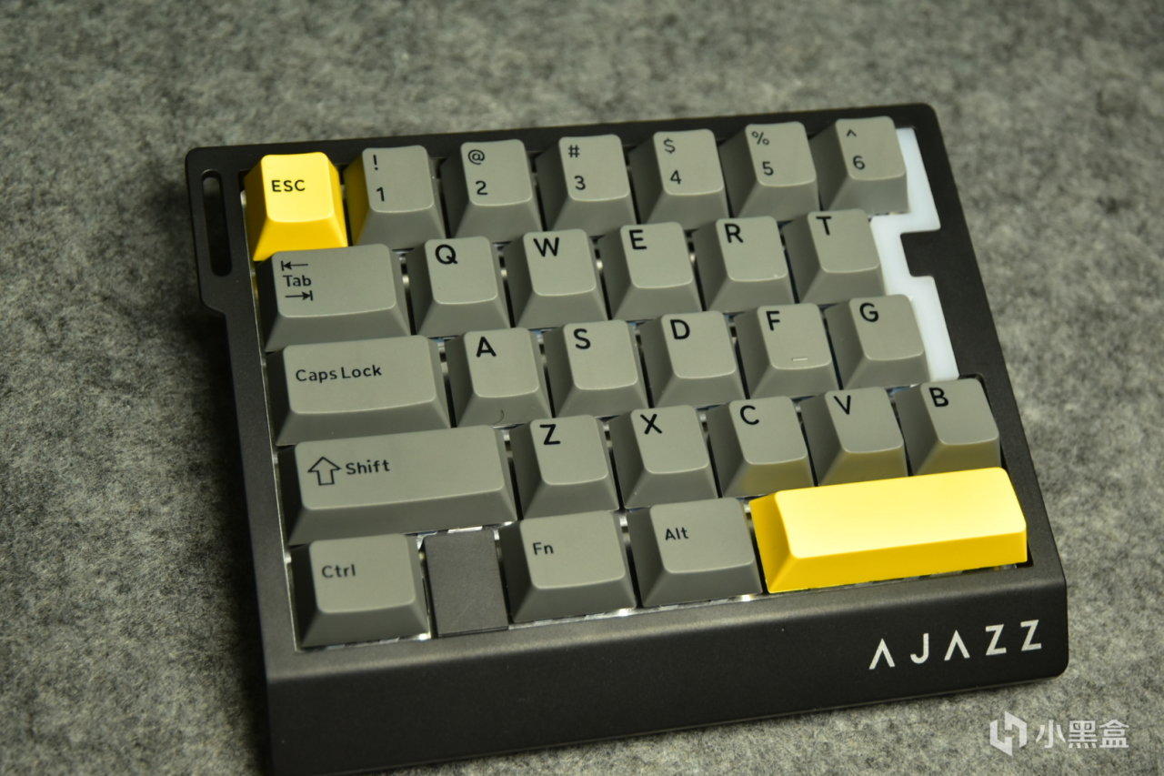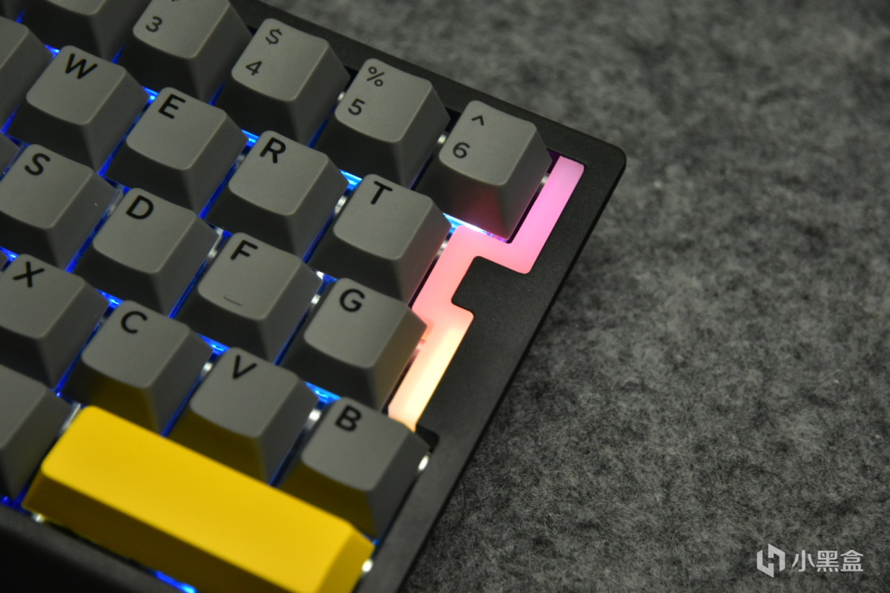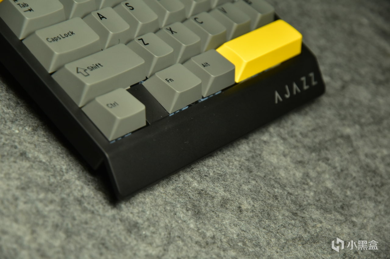 键盘的键帽为PBT材质,经久耐用不易打油,这点不必多说,键帽不是纯黑色,而是偏灰色,搭配黄色的 Esc 键和空格键,整体看起来不会那么单调。