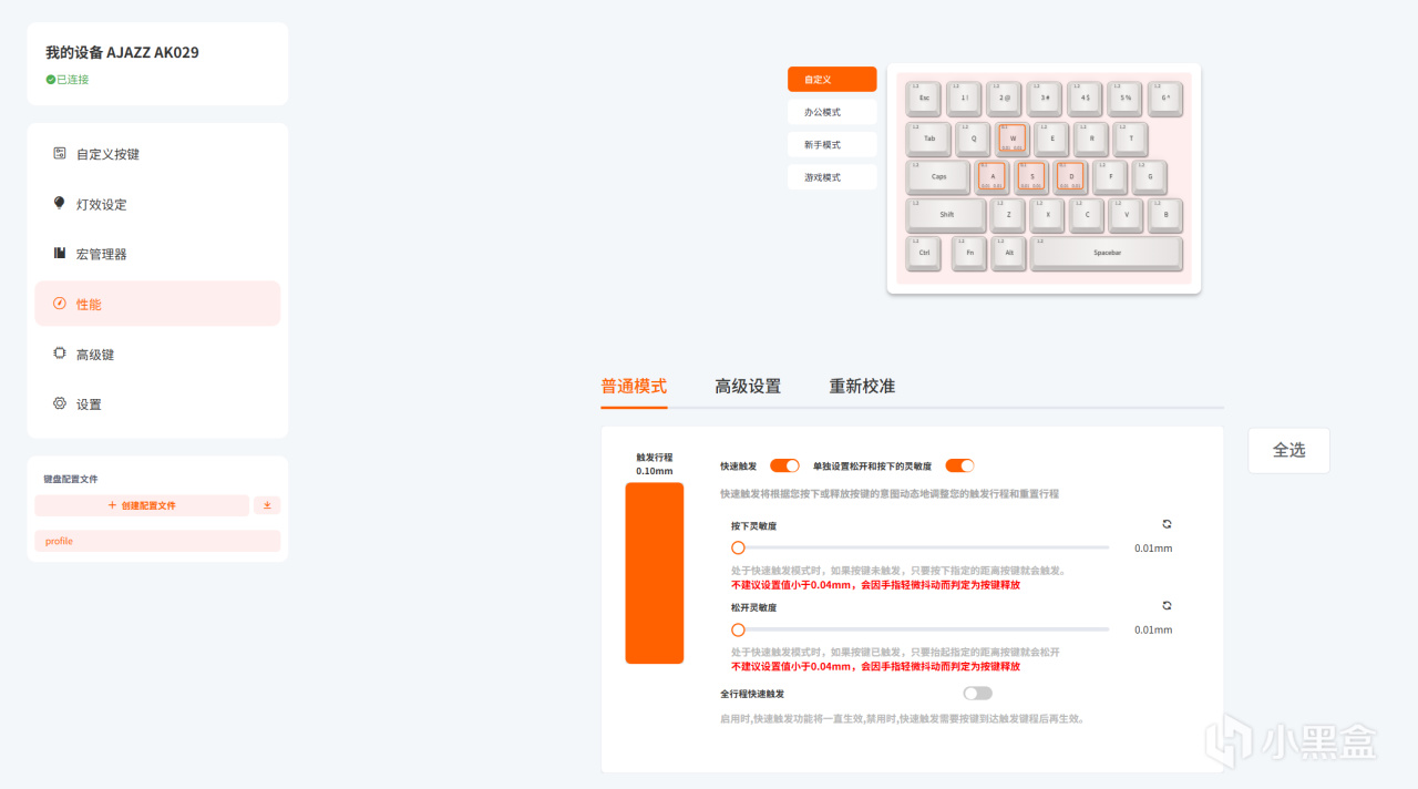 键盘的性能表现也十分出色,8K回报率,0.01mmRT精度,128K全键扫描率,完全能够满足电竞玩家的需求,我也将其触发和重置行程调到最低试了下,没有断触或者自动触发的情况发生。