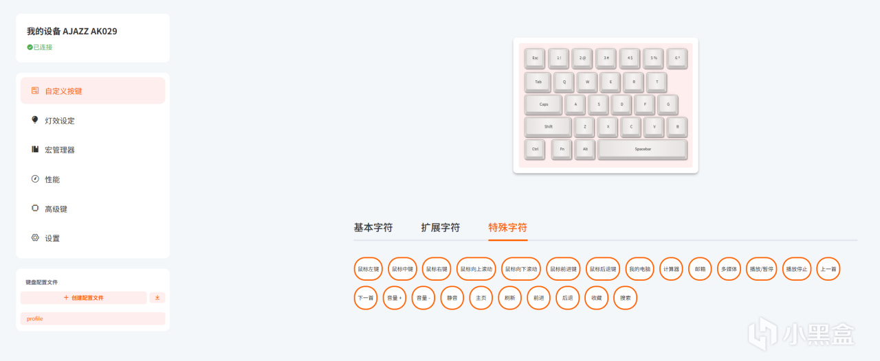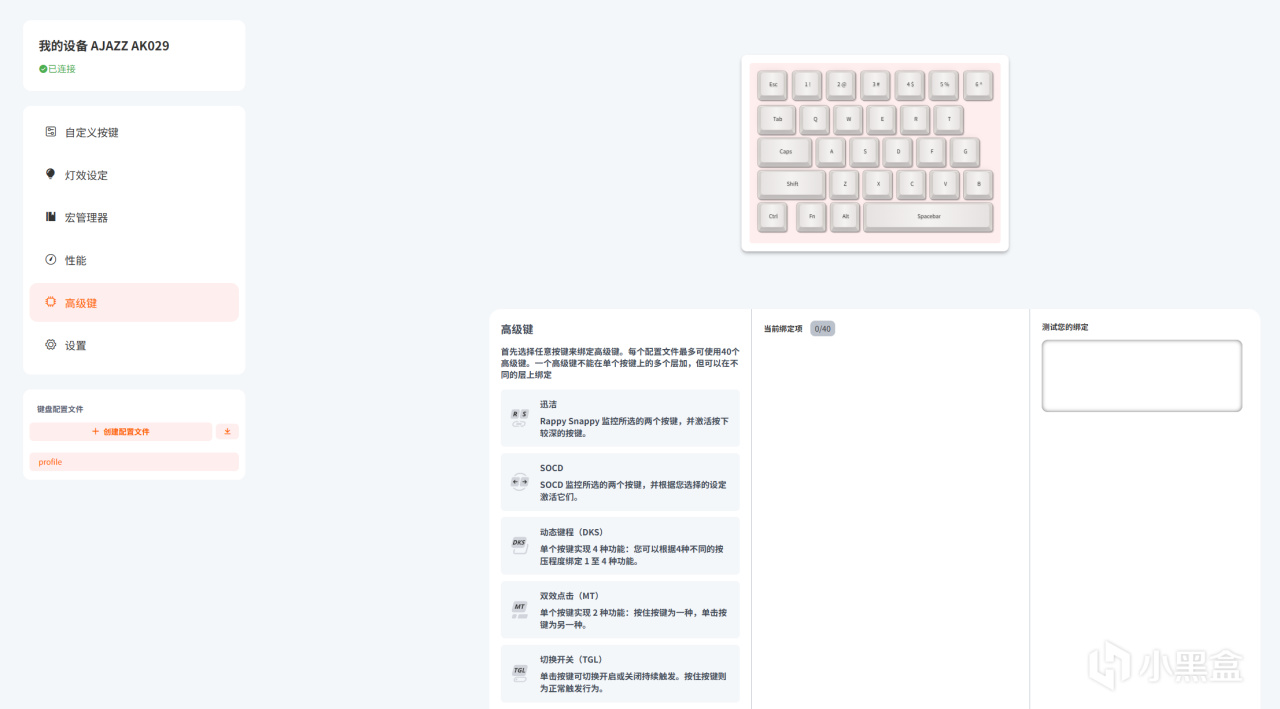 键盘的网页驱动非常简约,没有做过多的装饰,不过各种方框圆润的边角看起来还是不错的,虽然键盘很小,但还是可以自定义按键功能,除了基础的按键,竟然还可以绑定鼠标的按键滚轮,可玩性会更高。令我没想到的是,键盘竟然还支持音乐律动,只是需要下载插件。