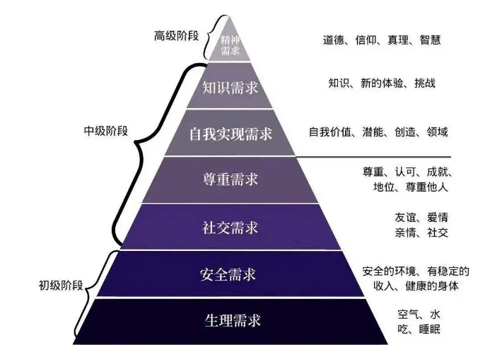 根据马斯洛的需求层次理论(Hierarchy of Needs),人有不同层次的需求,往往低层次需求满足后,人就会追求更高层次的需求。