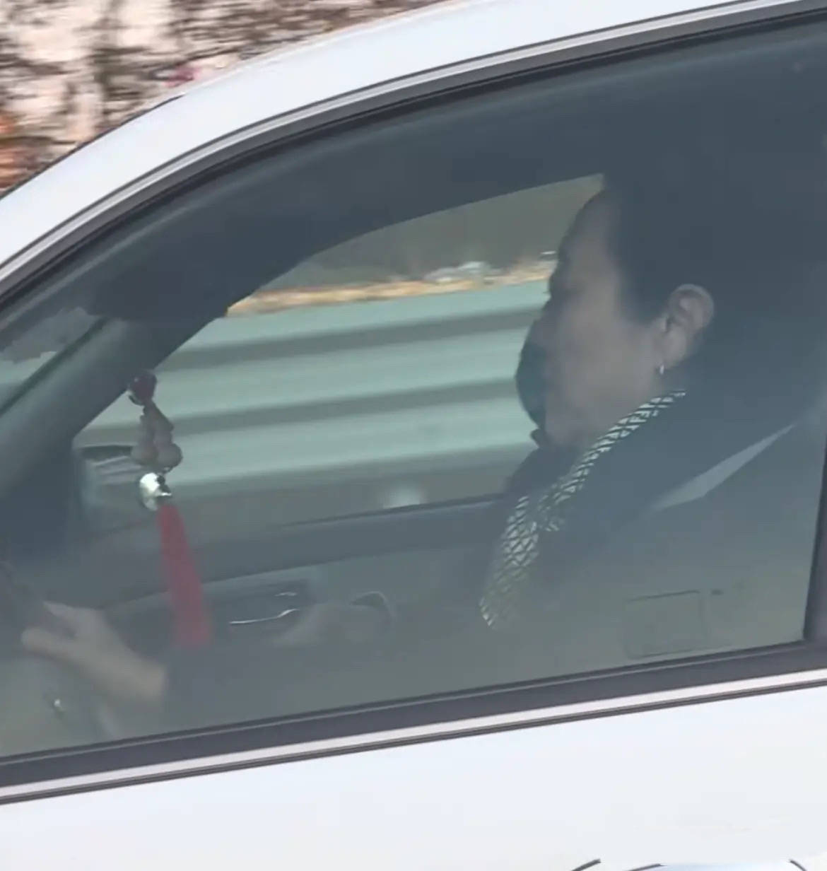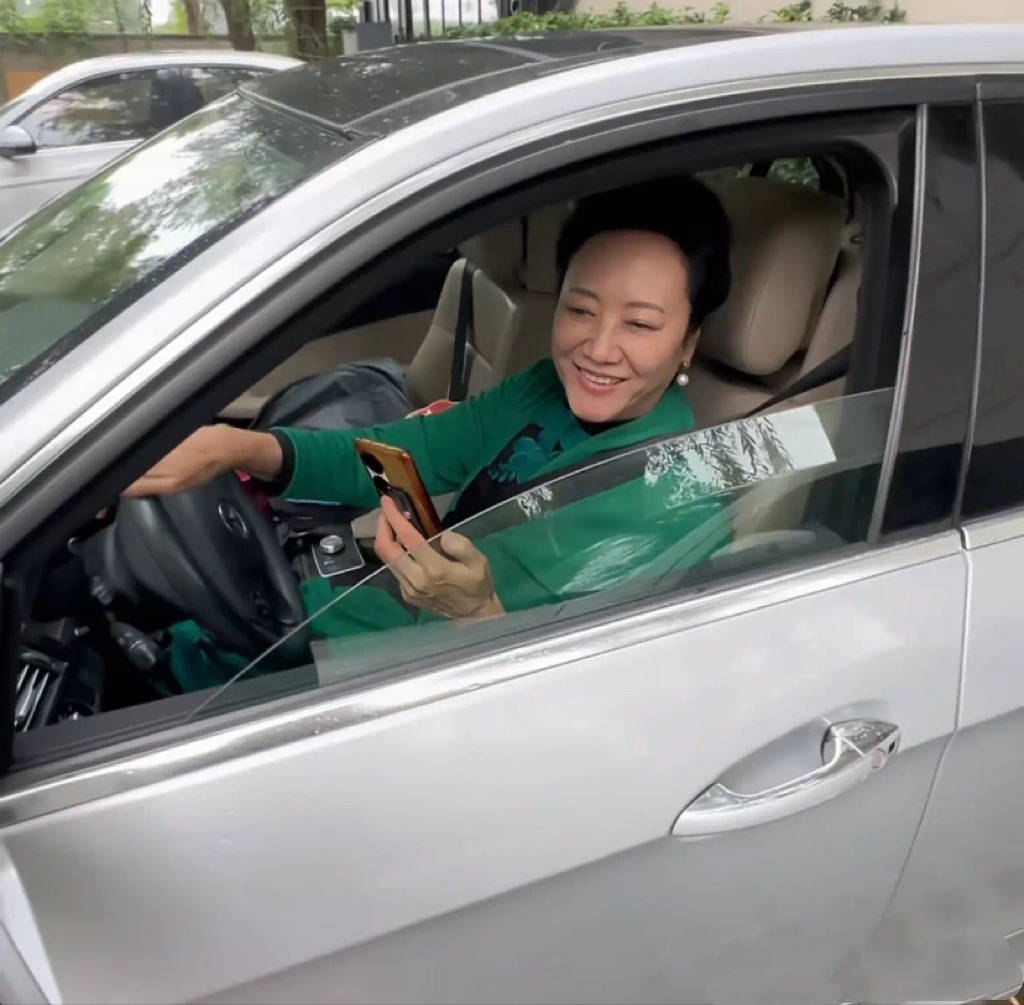 王丽云坐在驾驶室,是亲自掌控方向盘的。她穿了一身黑色衣服,系着精致的丝巾,看起来很优雅贵气特别富态。