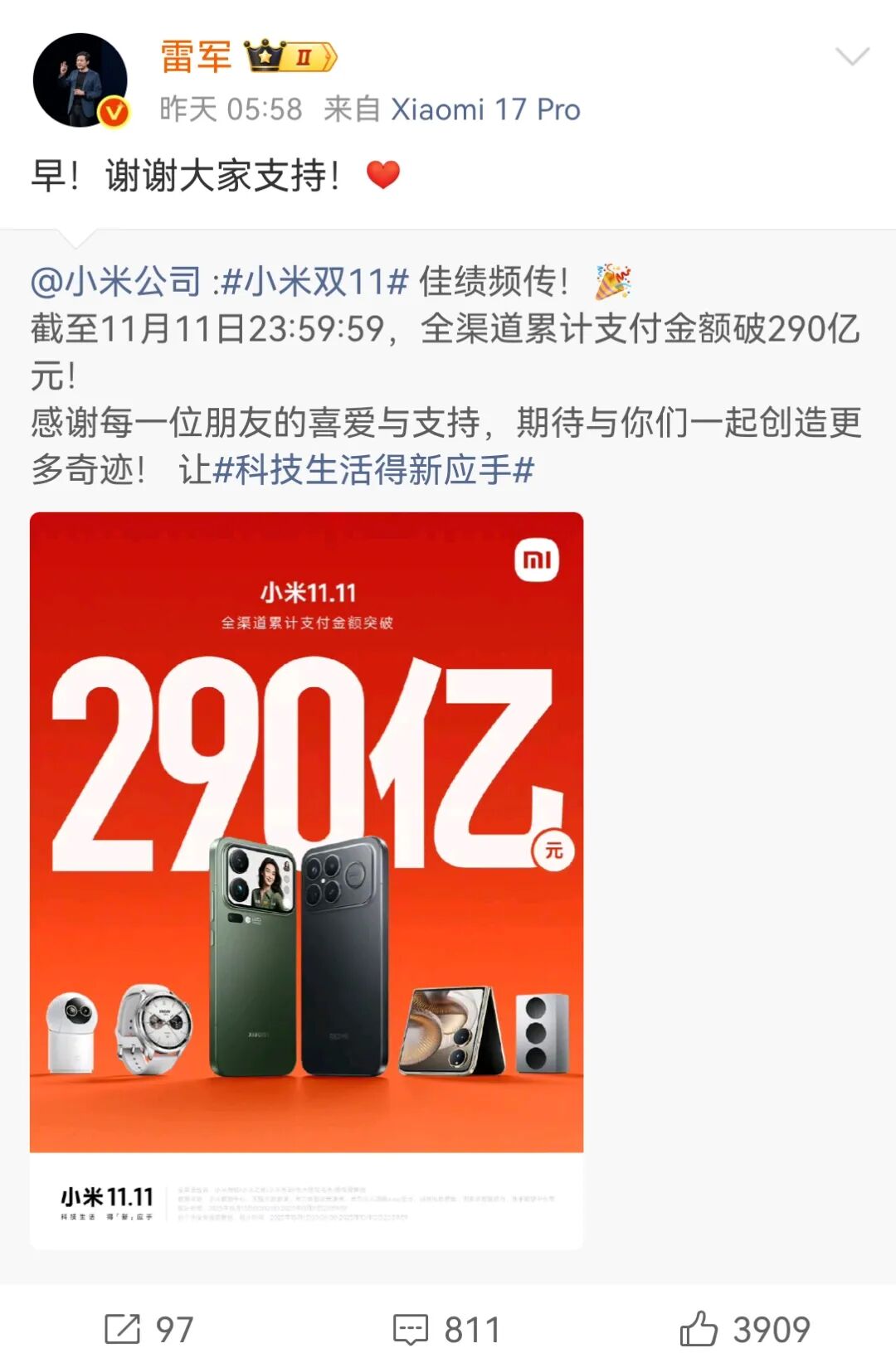 此外,在刚刚结束的双11大促中,小米同样交出了一份亮眼的成绩单。根据官方数据显示,截至11月11日23:59:59,小米全渠道累计支付金额突破290亿元,表现十分抢眼。次日清晨,雷军也对这一战绩作出回应,感谢广大消费者对小米的支持。