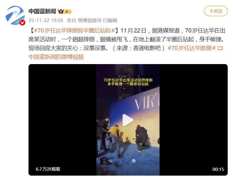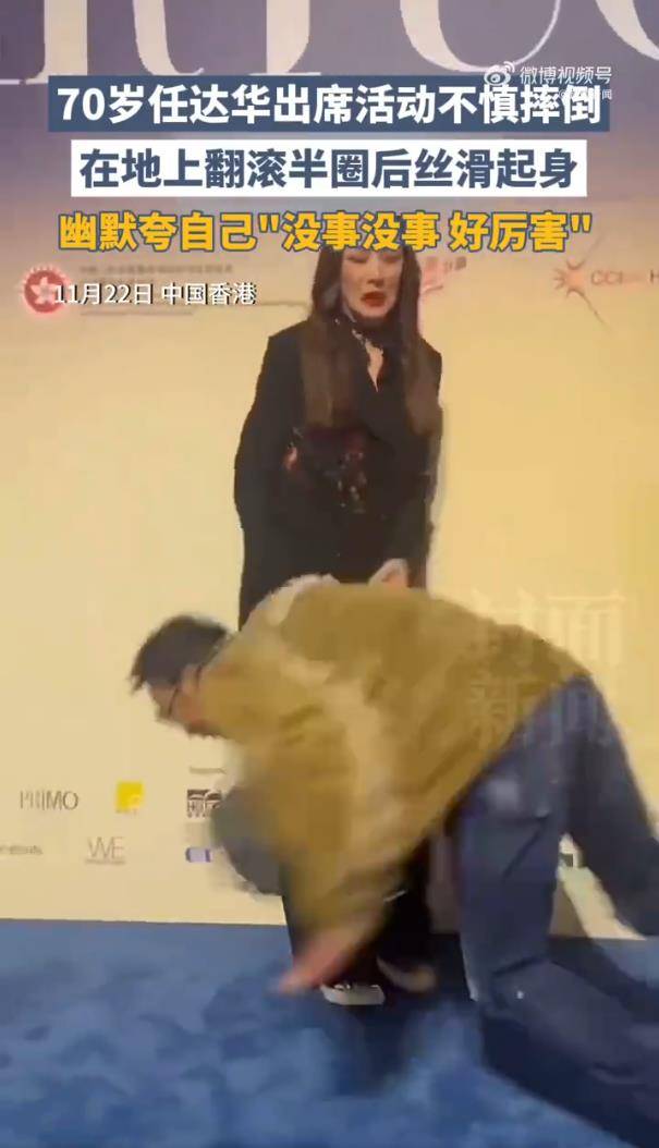事情发生在2025年11月22日的香港某时装活动现场。任达华在舞台上不慎被地毯绊倒,一个趔趄向前扑去,眼镜当场甩飞。惊险一刻,他并未硬扛,而是顺势倒地,身体利落地翻滚了半圈至一圈半,完美缓冲了冲击力。紧接着,他毫不停顿地迅速站起,整个过程一气呵成。