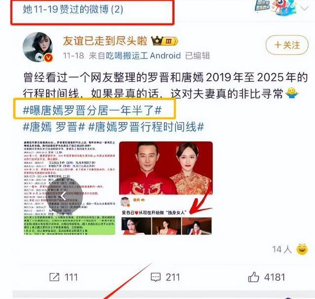 张歆艺前几天突然点赞了一条说唐嫣罗晋分居的帖子,没过多久又悄悄取消了。整个过程就像个“手滑”的小意外,可关键是,她既没解释为啥点赞,也没向唐嫣罗晋两口子道个歉。