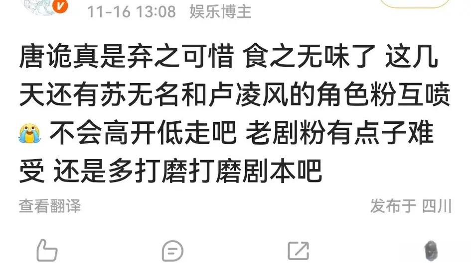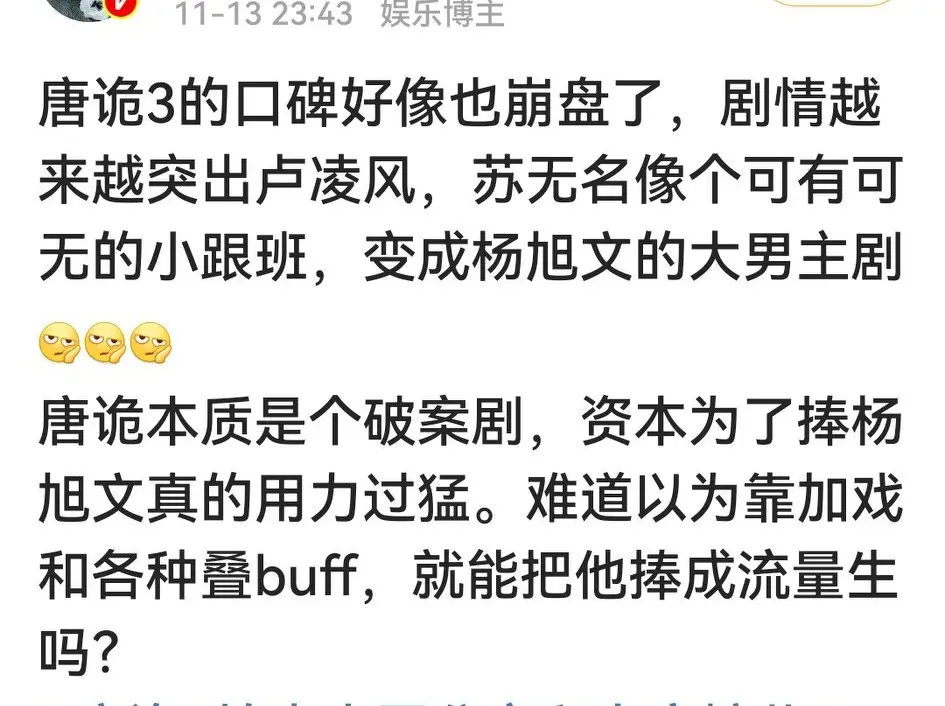 剧本身拉胯就算了,演员粉丝之间也没一刻消停。先是杨旭文粉丝联合抵制《唐诡4》,列了五大理由拒让偶像续演卢凌风,吐槽角色被边缘化、沦为工具人,还怕长期绑定IP限制戏路,担心杨旭文被过度消耗,错失优质资源。
