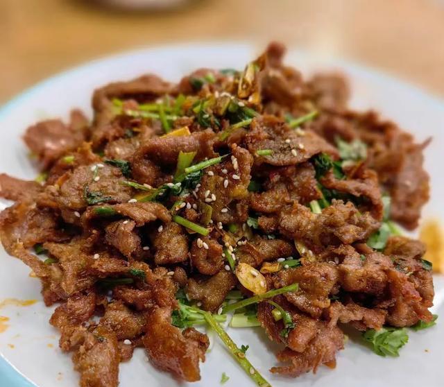 这家羊汤馆做的孜然羊肉,羊肉切的是略厚一些的片,然后上浆过油炸出来的,羊肉炸的略显干巴,因此吃起来有烤羊肉串的味道。