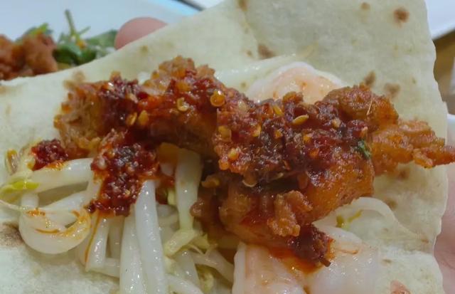 这豆芽炒的倒是中规中矩,酸甜辣三种味道混合在一起,加上豆芽本身就清爽,用来卷饼吃非常过瘾。