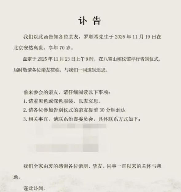 罗晋父亲告别仪式定于11月23日上午9时在北京八宝山殡仪馆举行,讣告中特别要求参加者穿着黑色或深色服装,并提前半小时抵达。