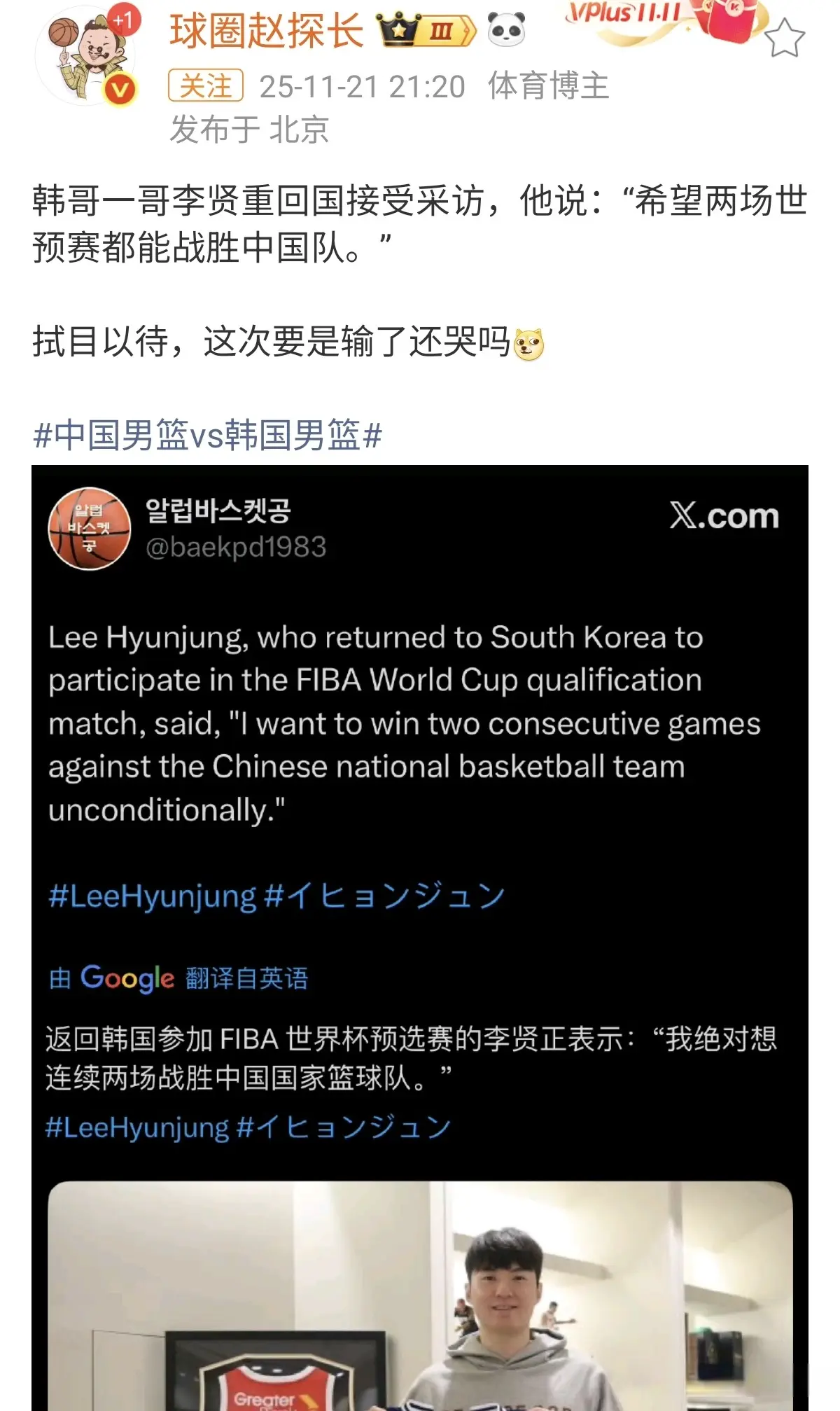 就在前天,韩国男篮核心球员李贤重对中国男篮放出狠话,他说要连着干翻中国男篮两场!