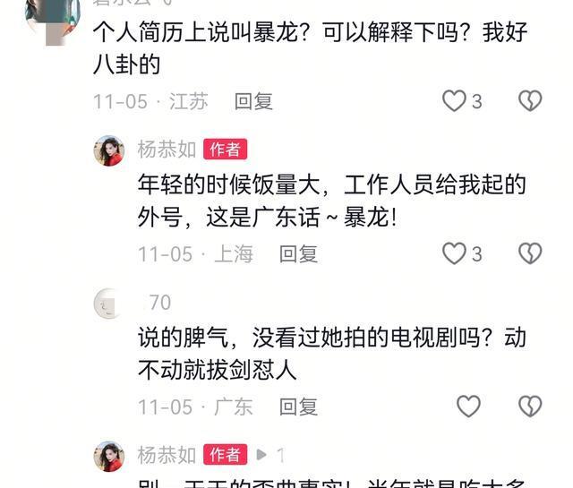 当有网友问起为什么有个绰号叫暴龙时,她一点也不生气,耐心打字解释:年轻时拍戏饭量大,工作人员给起的,是广东话,不是脾气大了。