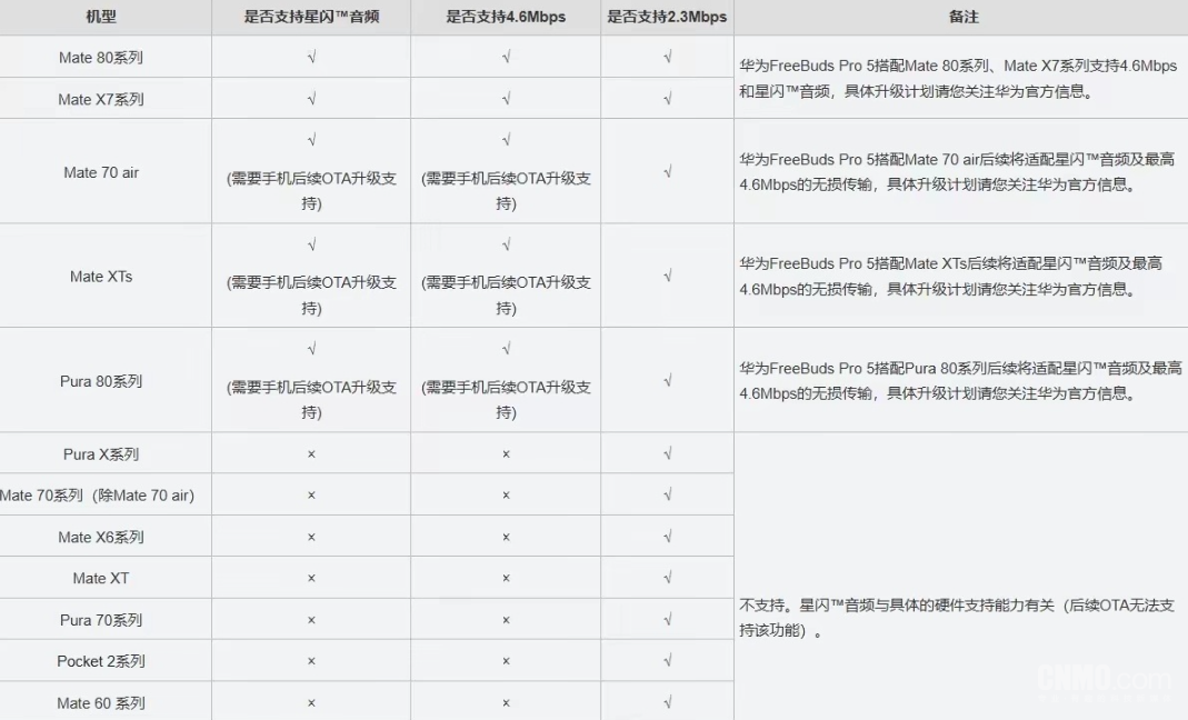【CNMO科技消息】11月26日,CNMO注意到,根据最新的华为官方兼容性列表,华为多款机型将支持星闪音频功能。其中Mate 80系列和Mate X7系列已原生支持星闪音频和4.6Mbps无损传输。而Pura 80系列、Mate XTs和Mate 70 Air等机型则需等待后续OTA升级才能获得完整的星闪音频和4.6Mbps无损传输支持。