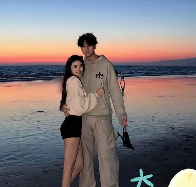 二人在海边夕阳下甜蜜相拥,配文“Happy 20 to 宝宝lp”!目前这位男生在英国留学,目测也就20多岁。