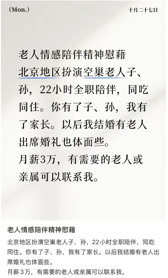 年轻人在社交平台发布“求职帖”,列出自己擅长的服务:做饭、聊天、打扫、陪诊……甚至有人开始组建团队,把这当作一份正经事业来经营。