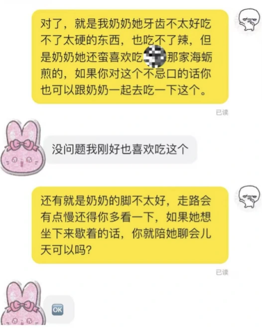 有人找到“外包孙女”后,会嘱咐他们注意事项,比如奶奶牙口不好,吃不了太硬、太辣的东西,奶奶喜欢吃某家小店的海蛎煎,希望可以陪同前往,还告知奶奶腿脚不好,走一段路,就需要休息一会。