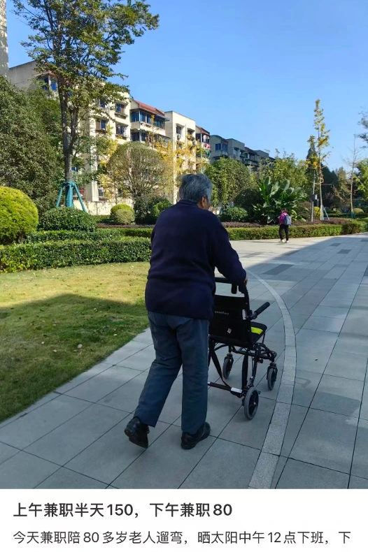 有人接单陪老人散步、逛超市,去熟悉的小摊买老人最爱吃的水晶包;还有人早上陪老人在公园晒太阳,放松心情的同时,还能赚点生活费。
