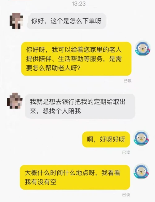 还有一些老人,想要去银行办理业务时,在网上“下单”雇个年轻人陪自己同行。