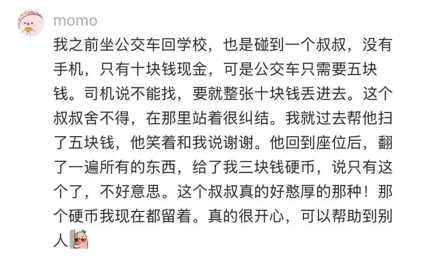 有人坐公交遇到没有零钱投币的人,会主动帮忙;