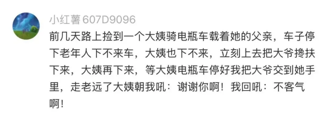 一个在深圳工作的女孩,在评论区写下了自己的经历——去年冬天,远在东北的父亲突发旧疾,她赶不回去,是一个在哈尔滨的男生帮她跑了两趟医院,陪她爸挂号、拿药、签字,还发来视频报平安。