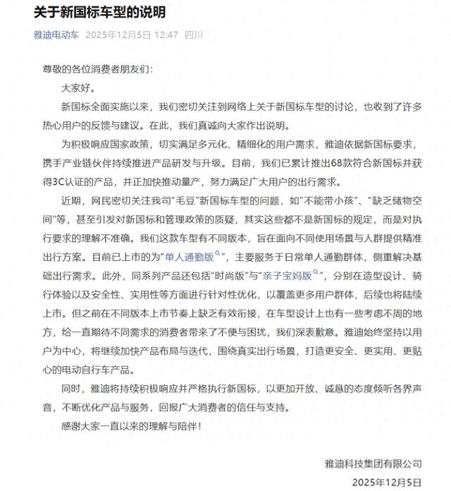 近期,网民密切关注我司“毛豆”新国标车型的问题,如“不能带小孩”、“缺乏储物空间”等,甚至引发对新国标和管理政策的质疑,其实这些都不是新国标的规定,而是对执行要求的理解不准确。我们这款车型有不同版本,旨在面向不同使用场景与人群提供精准出行方案。目前已上市的为“单人通勤版”,主要服务于日常单人通勤群体,侧重解决基础出行需求。此外,同系列产品还包括“时尚版”与“亲子宝妈版”,分别在造型设计、骑行体验以及安全性、实用性等方面进行针对性优化,以覆盖更多用户群体,后续也将陆续上市。但之前在不同版本上市节奏上缺乏有效衔接,在车型设计上也有一些考虑不周的地方,给一直期待不同需求的消费者带来了不便与困扰,我们深表歉意。雅迪始终坚持以用户为中心,将继续加快产品布局与迭代,围绕真实出行场景,打造更安全、更实用、更贴心的电动自行车产品。