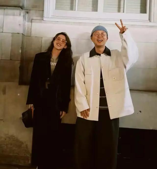 杜海涛带着渔夫帽圆框小眼睛,穿着衬衫笑得眼睛眯成一条缝,和章泽天两人默契的做着比耶的手势对着镜头合影