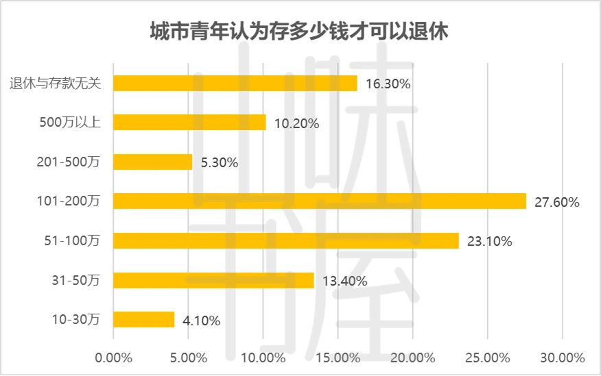 需要存多少钱才能让自己退休时,23.1%的人选择了“50-100万”,27.6%的人选择了“100-200万”。在北上广深等一线城市,存够100万或许离买房还很遥远,但已经可以作为年轻人初入职场为之奋斗的第一个目标。