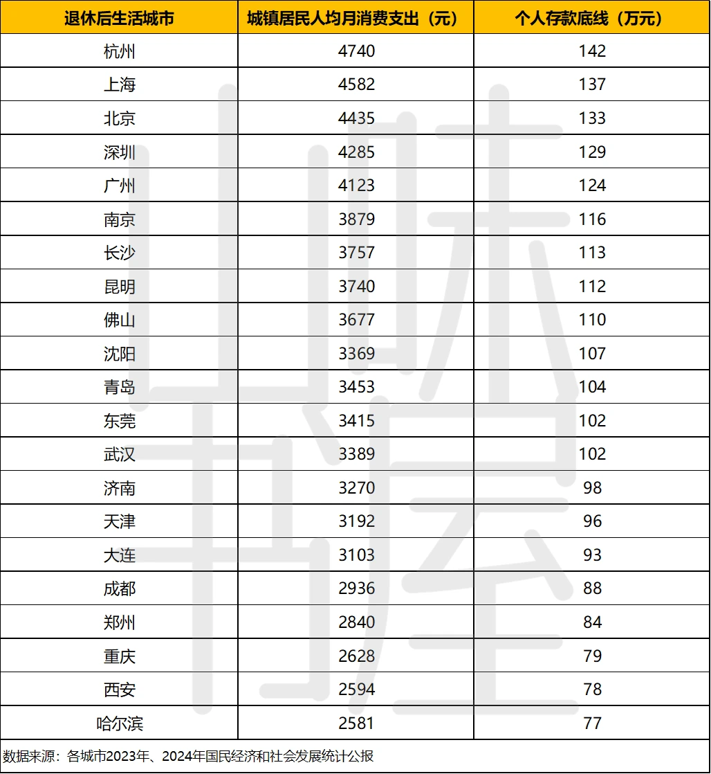 按这个逻辑,把各地统计局公布的人均年消费支出最新数据作为退休后的日常开支标准,把这个数字乘以25,就是提前退休的“存款底线”。