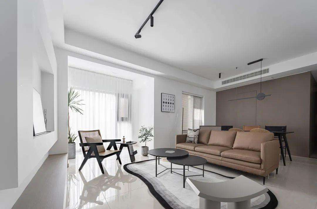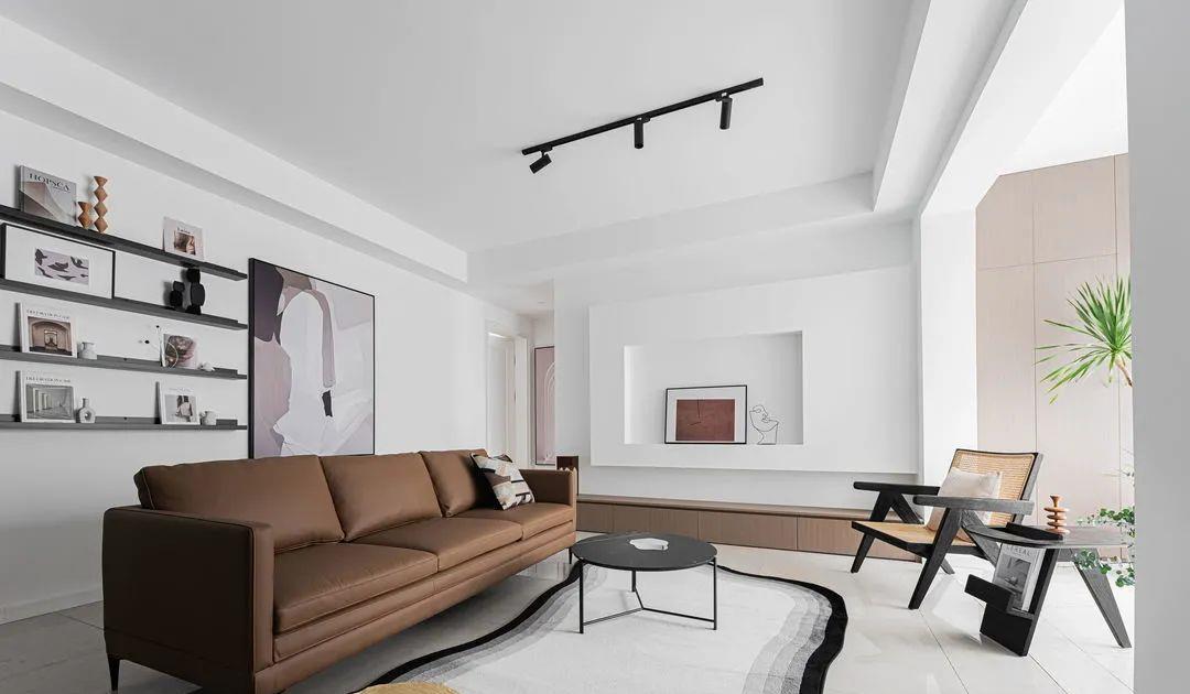 客厅给人的第一感觉,就是简约大方。大面积使用白色,一定程度上提亮了空间,加上深色家具,和黑白相间的地毯,又不缺乏时尚气质。