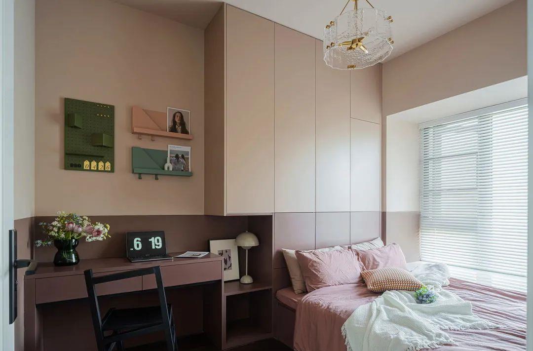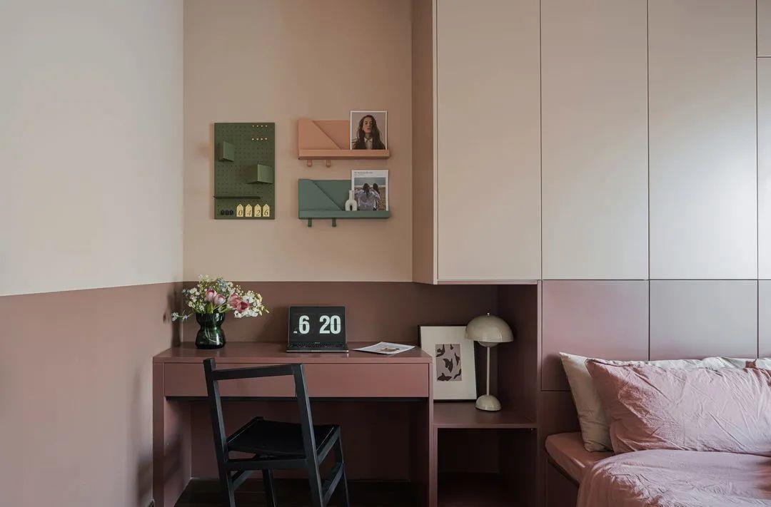 书房从功能性延展出发,采用定制设计,做了榻榻米、衣柜和书桌一体设计,满足了客房、办公、休闲等需求。由于空间不大,屋主又不希望过冷设计,因此采用上下分色,以浆果色搭配灰粉色。