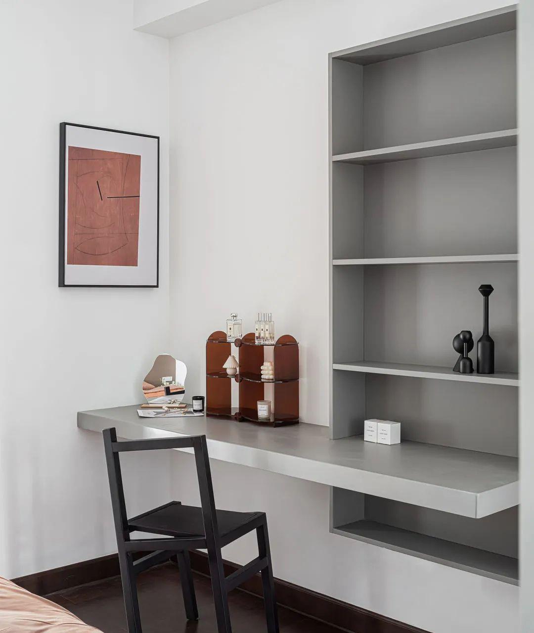 床尾在不影响过道走动的前提下,定制了一个宽50公分的悬挂梳妆台,同步嵌入设计了壁龛收纳,整体设计简洁不显拥挤。