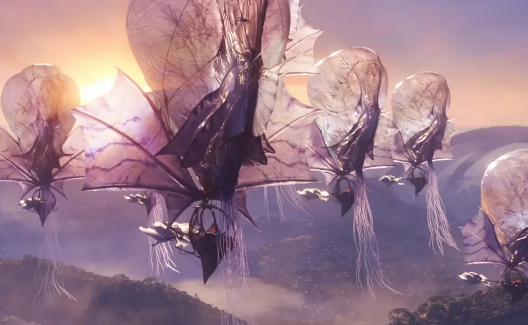 游牧民族“风之商人”的飞天坐骑,是名为美杜莎的巨大水母,触须的长度足足35米,它飞跃天空时的光与影交互,将生物机能与机械美学结合。