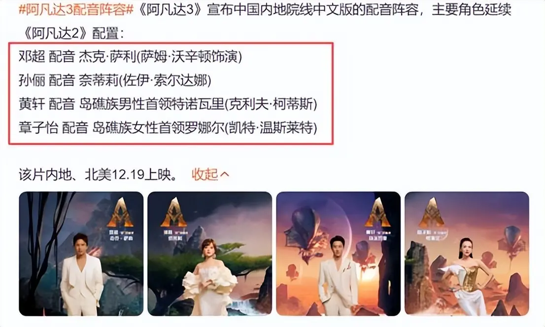 值得一提的是,《阿凡达3》的中文配音阵容,没有沿用曾经的配音演员,而是由邓超、孙俪、章子怡、黄轩组成了“全明星”阵容。