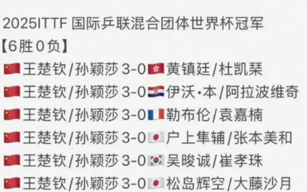 本次混团世界杯,王楚钦/孙颖莎两人只要搭档就是拿3分,六场比赛无一败绩,日乒换了两次组合都没有从这两人手中拿到任何的1分。