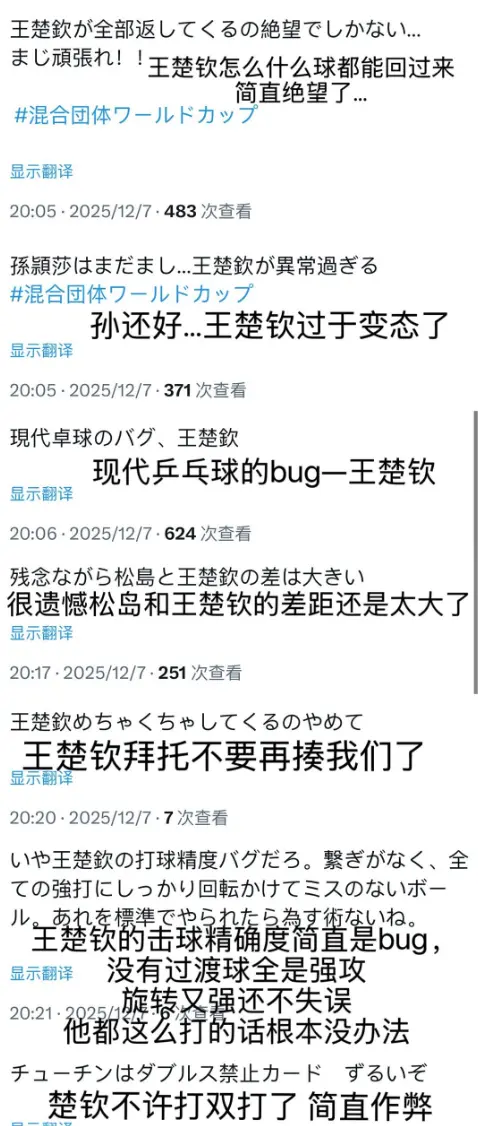决赛后,日本球迷们在推特上疯狂的盛赞王楚钦:摆脱王楚钦不要再揍我们了,王楚钦不许打双打了简直是作弊,现代乒乓球的Bug王楚钦,松岛跟王楚钦的差距还是太大。